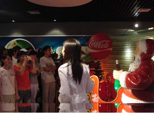 参观团由明水校区各院系的60名同学组成。带着喜悦与好奇的心情,同学们在工作人员的带领下进入了公司的放映厅,在此,同学们受到了热情的款待,并观看了可口可乐放映的宣传片。随后,参观团走进了公司的“时光隧道”,观看了了可口可乐各个时期的发展过程。穿过“时光隧道”,展现在同学们面前的是可口可乐高自动化的生产流水线,那里的工作人员详细地向同学们介绍了制造可乐的整个过程:水净化系统,糖浆制造系统,吹瓶系统以及玻璃瓶生产线。当听说每个庞大的系统只需4个人时,大家都惊叹不已!但最让大家心旷神怡的是公司的博物馆展厅,在此,同学们参观了圣诞老人模型,第一杯可乐卖出时的小屋模型——可乐木桶,以及与可口可乐合作的“魔兽世界”。与此同时,工作人员还向大家接受了公司的历史与MG电子。同学们在展厅纷纷合影留念。
