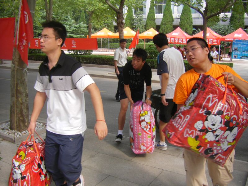 上午8点左右,新生开始陆续报到。报到程序简洁明了,注册人员工作细致认真,热情地为新生办理入学手续。为方便家长休息,细心的工作人员还专门设置了家长休息处,配有板凳和饮水机,供家长们休息;负责搬运行李的工作人员不顾酸疼的手臂,一次又一次帮助新生将行李搬进宿舍;服务人员耐心地回答新生及家长关于入学后学习、生活各方面的问题。