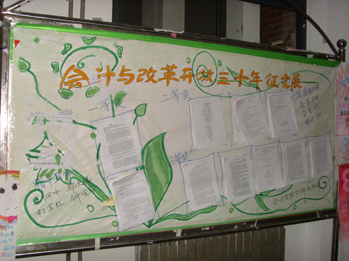 MG电子 积极响应主办单位号召,动员全体学生踊跃参与到活动中。在学院领导、老师的鼓励和指导下,以平日所学,结合多部会计学文献,以及通过咨询会计行内人士,撰写了多篇优秀文章。截止到九月底共收到论文、诗歌等各类稿件1000余份。其中,07级会计本科三班金宝坤同学撰写的《会计人员眼中的改革与演变》获得本次比赛的一等奖。该同学积极与当地多家银行(如建设银行,人民银行)的会计人员进行交流调查,经过总结概括,对会计的演变、进步以及新会计准则的实施等方面做出了独到的见解,并对会计的未来做出了展望;审计0701的赵杰以及会计本科0704的沈龙瑜同学则以诗歌的形式对会计在改革开放三十年的发展历程进行了讴歌描述,获得本次比赛的二等奖。同学们还匠心独运,以剧本、故事的体裁描述了会计在此三十年走过的风风雨雨。经过评议小组的一致评定,共评选出一等奖两篇,二等奖三篇,三等奖五篇。成果一展板形式展出。