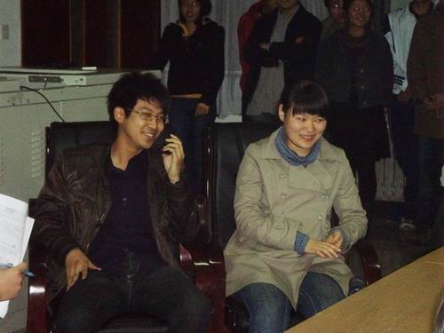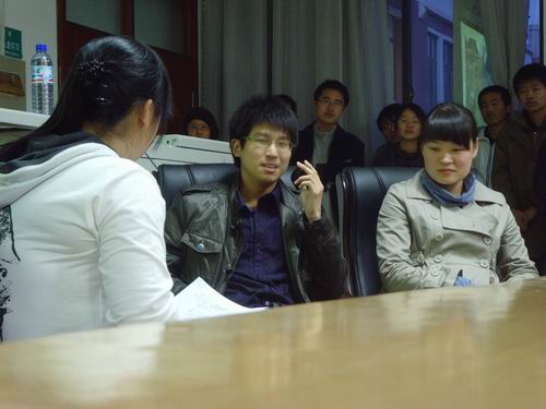 本次访谈邀请到的现场嘉宾是MG电子 第二十九届学生会主席胡啸(2008年公务员考试被青岛海关录取)和MG电子 第二十九届学生会副主席贾琳琳(2008年公务员考试被烟台国税录取)。为了更好的了解两位嘉宾,节目开始前首先播放了前方记者发回的场外报道——“同学眼中的他和她”。
