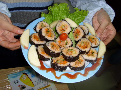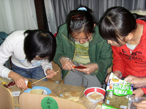 在主持人幽默风趣的开场白和每队精彩简短的介绍后,比赛正式开始。所有的参赛队员都忙得不亦乐乎,水果、糕点、寿司等食物齐齐亮相,让你怀疑自己是否置身于豪华酒店的厨房之中。40分钟后,参赛作品全部完成,来自学生会的四位评委从色、香、味及创新四个方面,对各参赛队的作品进行了评分。