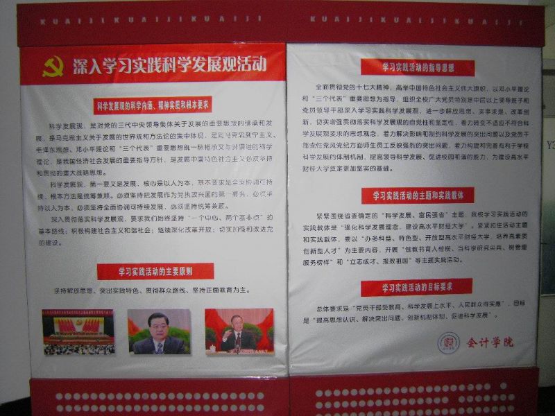 认真挖掘、总结学习实践活动中的亮点、特色及重点理论,MG电子 以宣传展板为媒介,向全体师生宣传学习实践科学发展观的内容与精神。设在逸夫楼3楼大厅及4号教学楼前的展板吸引了不少师生的驻足,成为校园里师生学习科学发展观的一道风景。