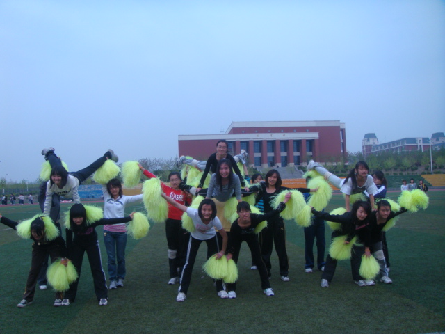 啦啦队由大一大二共20人组成,她们队形整齐,动作一致。为了一个动作的标准一致,她们不断的重复这个枯燥的动作,没有怨言只有乐观坚持。她们整齐的队形,统一的动作,让人赞叹。当音乐响起时,金黄色的啦啦花上下飞舞,青春活力与激情洋溢在这里得到了很好的结合。