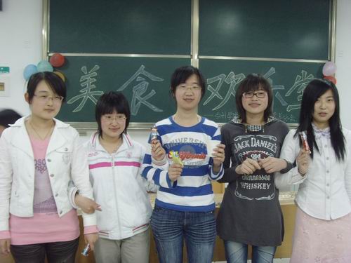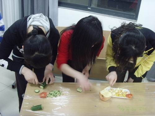 活动分为沙拉比赛、嗑瓜子比赛和做寿司比赛三个环节。比赛现场到处是一片热闹的场面——做玉米沙拉的同学们用协会提供的各种材料充分发挥她们的创造力,制作出一盘盘精美好吃的沙拉,然后由评委们进行品尝并评出了一名获胜者;紧接着的嗑瓜子比赛,选手们纷纷秀出“嘴上功夫”,不一会儿,桌上便有了瓜子壳小山,获胜者得到了一包瓜子的奖励;最后的做寿司比赛,选手们各自施展才华,用黄瓜、火腿、蟹肉卷、包菜等简单素材为评委和观众们奉上了一场小型寿司宴,不禁让人垂涎三尺。