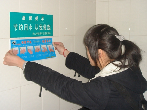 日前,MG电子 基本功部成员到章丘疾控中心学习了相关预防甲型H1N1流感及“六步洗手法”的知识。15日晚上7点,基本功部成员在校园各个净手处(洗手间、食堂、宿舍的公共洗漱间)张贴印有“六步洗手法”图样的宣传画报,指导大家用科学的方法净手。同学们看到宣传画后,纷纷表示“六步洗手法”及时又实用,对大家预防甲型H1N1流感很有帮助。