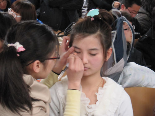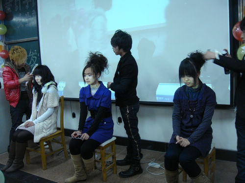 比赛开始前主持人介绍了评分细则,参赛选手要在30分钟内完成参赛作品。比赛开始后,在台下彩妆类选手各展其能,淡抹浓妆总相宜,发型设计类的模特的新发型也在设计师灵巧双手的一疏一剪下初现端倪。与此同时,在台上三位专业发型师分别对三位模特进行发型设计,精湛的手艺引得观众阵阵喝彩。30分钟后,选手们完成了各自的作品。彩妆类和发行设计类选手依次登台,分别介绍了各自的创作灵感和思路。其中,彩妆类的作品多以桃红色为主,迎合了春暖花开的主题,特别是一组参赛作品在服装上独树一帜得采用了民国时期清纯学生装一改时代学生的装束,体现了女生的青春魅力和复古潮流的时尚气息,引来观众的掌声。而发型类的作品也是千姿百态,有温婉大方的,简单干练的,也有甜美可爱的,更有另类的吉普赛风格以及具有民族特色的。最后,所有的模特在动感的音乐中绕场一周,进行了集体展示,观众对自己心仪的作品进行投票,本次初赛的结果将会于两天内以海报的形式公布,敬请同学关注。