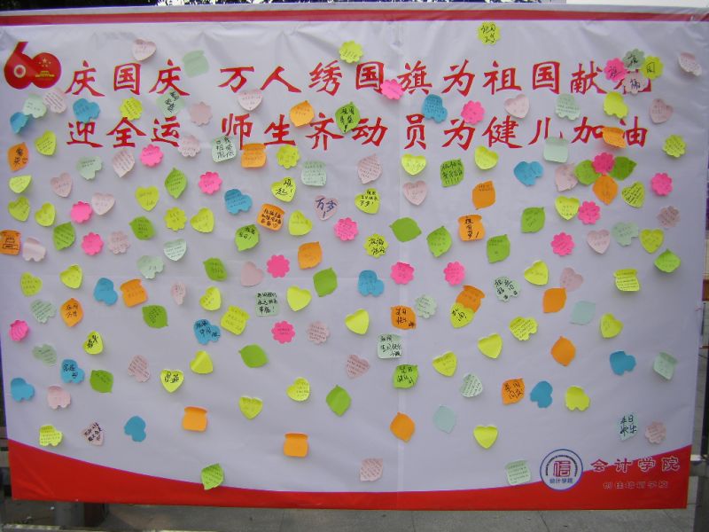 此外,MG电子 在现场设立心愿便利贴,大家在心形、星形的便利贴上纷纷留言,写下对祖国祝福的话语。写有“庆国庆,万人绣国旗为祖国献礼,迎全运,师生齐动员为健儿加油”的条幅上贴满了现场采集的笑脸,写满了来自全校师生的祝福。最后,全体同学与国旗合影。
