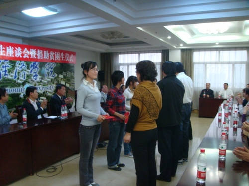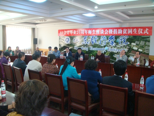 八六级校友毕业20周年师生座谈会暨捐助贫困生仪式在学校办公楼七楼会议室举行。原山东经济学院院长任辉教授,MG电子
