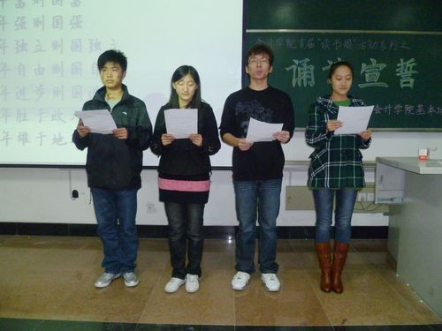 仪式开始之前,参加同学陆续入场,并在预祝活动圆满成功的条幅上签名。仪式正式开始之后,全场同学起立,在主持人的带领下进行了“诵诗宣誓”。誓词内容节选自梁启超的《少年中国说》,恰当地表达出活动的目的,强调了年轻人读书的重要性。随后,同学们一起观看了改编自余华同名小说的电影《活着》。活动过程中,每位到场同学都得到了一份书单,上面印有由基本功部成员精心挑选并予以推荐的书目。