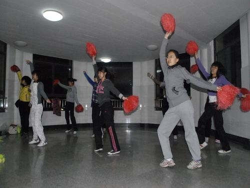 据了解,团体操共分为两个项目,分别是统编操和自编操。统编操由男女生各16名共同完成,舞蹈内容全校统一。而自编操则是同学们自己找伴奏、编动作,最终由16名女队员表演的比赛项目。自3月7号开始训练以来,为了到达高水平的要求,队员们每天的训练时间长达6个多小时。早上从六点到七点半,下午从五点半持续到七点,晚上则从七点半一直训练到十点半。在整个训练过程中,文艺部和女生部成员尽心尽力,力求每个动作准确规范、整齐到位,每个动作都要求定型训练,以保证整体效果。训练场上,队员们像一个个跳动的音符,充满着朝气与活力。大家为了将动作做到最好,还经常利用课余时间共同练习,互相纠正动作。负责人告诉记者,训练至今,大家身上带着各种伤病,旧病未愈,新伤复发。韧带拉伤、膝盖积水在大家身上都算是小伤,两名队员因为伤势过重,遗憾的被迫退出。点点滴滴的付出诠释了大家坚强的毅力与不屈的精神,同时也换来了训练的进步。从训练伊始的凌乱散漫到现在的娴熟动感,从开始时队员们互不相识到现在的亲密无间,每一阶段的成果都是他们汗水浇灌出的花朵,每一次的提高都是他们团结协作的结果。他们是跳跃着的精灵,他们是舞动着的强者,他们用自己的坚持书写着激扬的旋律,他们用自己的汗水印下青春的倩影。