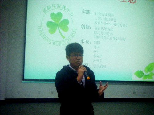 当晚宣讲会由MG电子 创新与实践中心四位2009级成员担任主讲人,旨在向大一新生概括介绍“挑战杯”比赛的性质、意义及其重要性,号召同学们积极参与社会实践,度过丰富且有意义的大学四年。讲座开场,关雨阳同学首先就MG电子 创新与实践中心的组织形式、成立理念以及公开纳新等相关事宜进行了简要说明;之后更是结合自身学习、工作经历与在座新生分享其参与社会实践收获的经验心得。随后,姜鲁同学则针对“挑战杯”与“调研山东”两项社会实践活动进行了重点介绍。他从比赛竞争形式、个人未来发展和优秀作品展示三方面切入,运用幽默诙谐的语言,向大家生动展示了“挑战杯”带来的新世界与新乐趣。“每个人的大学经历不可复制”,术钰同学的亲身经历,告诉了大家如何拥有有意义的大学生活。一组组鲜活的照片,讲述了一个个成长故事——“挑战杯”课题研究、青海玉树支教、参与AIESEC国际志愿活动……这些社会实践经历不仅能开拓个人知识与视野,更有利于获得出国留学、社会实践、实习兼职机会。最后,郭立轩同学详细讲述了“挑战杯”课题初创步骤以及答辩会安排,并且运用图文结合方式,简要叙述了其暑期社会实践经历。当晚九点整,本次“挑战杯”宣讲会在同学们热烈掌声中落下帷幕。
