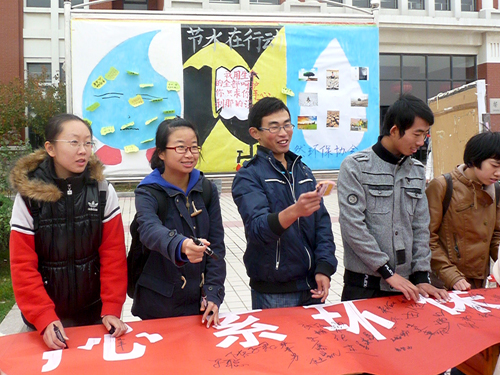 水是维系生命与健康的基本需求,地球虽然有70.8%的面积为水所覆盖,但是淡水资源却极其有限,世界上有超过十亿的人口无法获取足量而且安全的水来维持基本需求。承然环保协会希望以本次活动为契机,将节水习惯渗透到大家日常生活的点滴之中。为了扩大活动覆盖面,协会成员在前期进行了充足的准备,并采取了条幅宣传、网络宣传、海报展示等多种方式对此次活动进行宣传。由于宣传到位,活动一开始便吸引了大批同学的关注。写满节水警语的展板分外醒目,正中央一句“我用生命的全部呵护你,只求你手心刹那的温柔”更是撼动人心,触发了大家对浪费水资源行为的反省。同学们纷纷驻足,在节水横幅上郑重地签下自己的名字,许下一份对节水爱水的承诺。协会成员在为大家详细讲解节水重要性的同时,并向同学们征集了节水标语。据悉,本次活动将持续7天。