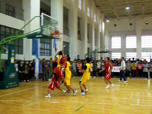 (筹)“流动杯”篮球赛“八进四”争夺战在明水校区篮球场打响。两支参赛球队分别来自MG电子