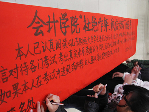 首先由赵鸿雁老师分别为同学们宣读了“MG电子 团总支致同学们的一封信”和《山财大学生考试违纪处理办法》的一些重要的考试违规条例。“成绩诚可贵,荣誉价更高。若为诚信故,两者皆可抛。”吕晓燕老师撰写的“一封信”中,字里行间都能感受到“诚信考试光荣,违纪作弊可耻”的观念。而之后,赵鸿雁老师又为同学们点名了几条易触犯的考试违规条例,例如不准随身携带手机、不准夹带小抄等,再次为同学们敲响了警钟。