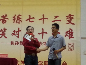 晚上7点,伴随着西游记片头曲《通天大道》,章金莱一袭红衣步入会场,现场顿时掌声雷动。章金莱为大家对西游文化的热情表示感谢后,详细介绍了自己与西游记的渊源。与当今动辄三个月出品的高产电视剧相比,《西游记》这部电视剧从1982年开拍,到1999底年完成续集,足足拍了17年,与玄奘师徒西天取经用时相同,已载入吉尼斯世界纪录。其拍摄过程中的艰辛与困难远远多于“八十一难”,回忆起拍摄红孩儿时火焰在身上烧的惊险一幕,章金莱直言:“当时我一度陷入昏迷,完成镜头可以说是九死一生。”章金莱的敬业精神感动全场,现场掌声经久不息。他说:“我们每个人的一生都是西天取经,都要经历九九八十一难才能取得人生的真经。每一个人心里都有属于自己的一座灵山,只要我们坚持不懈,努力进取,都有可能登峰造极。”他又针对当前大学生形象地比喻道:“大学生就像孙悟空带金箍一样,在我们求学道路上也要给自己带一个金箍,也需要约束自己。”精彩的比喻引人深思。