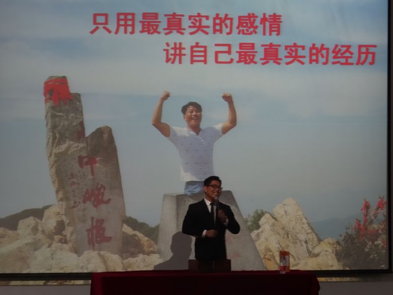 晚六点半,现场大屏幕首先播放了一段VCR,它记录着陈州从东岳泰山到南岳衡山,从北岳恒山到中岳嵩山,最后到西岳华山“双手登五岳”的壮举,在场的同学都被陈州坚韧顽强的精神所感染。在同学们热烈而经久不息的掌声中,陈州身着黑色西装,面带阳光微笑,双手撑着两个木盒,一步一步走入会场。首先,陈州向大家介绍了自己现在幸福美满的生活,他骄傲地说:“虽然我没有健全的身体,但我有健全的心灵、生活和梦想!”他乐观向上的态度和幽默风趣的话语博得了阵阵掌声。
