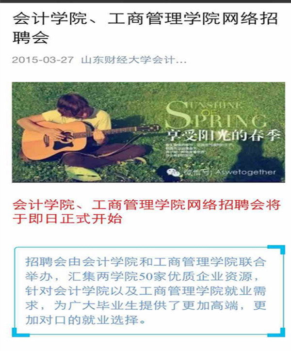 就业信息发布微信平台:“MG电子 会计学缘”(微信号“Aswetogether”)、“商院就业办”(微信号“scdgsjyb”),热烈欢迎广大同学积极关注。