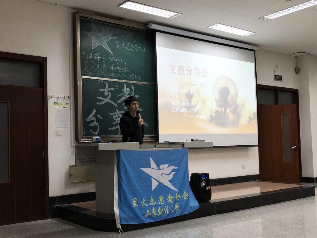 此次分享会共包括支教地点、生活、工作详情,支教总结与感受,答疑环节三方面内容,泰安队长卢昌勇、临沂队长谷莺鸽、聊城队长王潇、河南队长谢安相继步上讲台,向同学们分享他们支教过程中的所见所闻、所思所感,趣闻轶事,引得同学们不时发出善意的笑声。