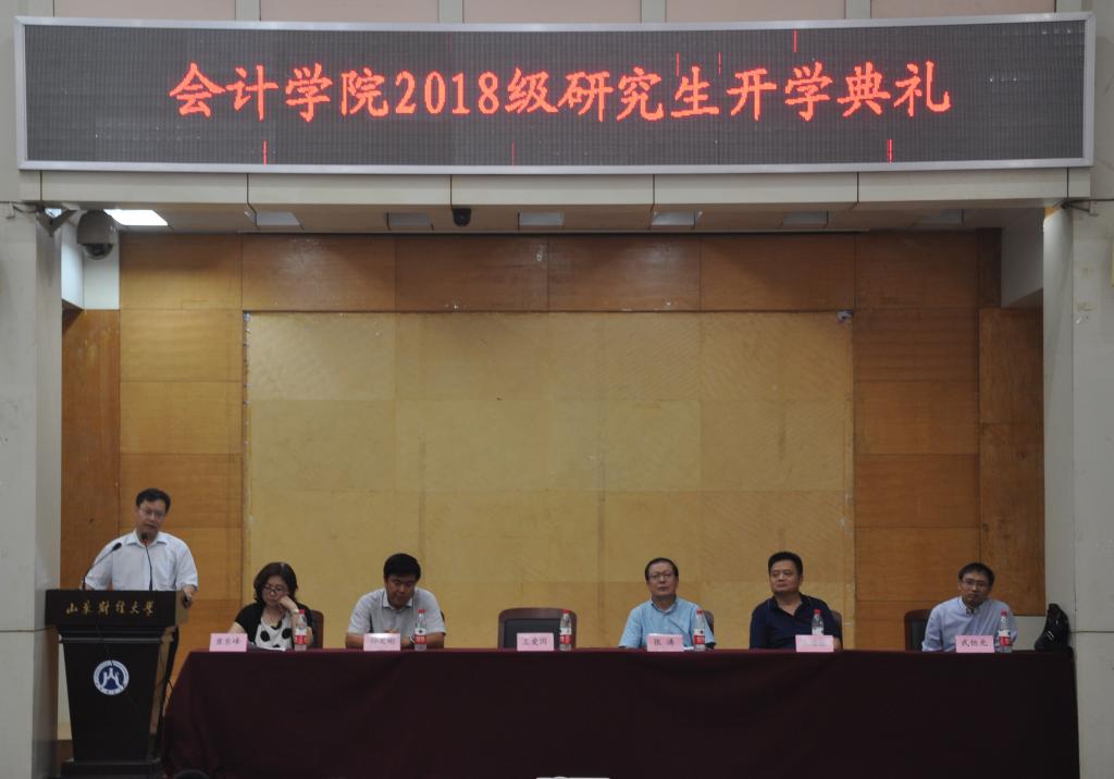 典礼开始首先由王爱国院长致辞。王院长首先对2018级研究生的到来表示诚挚热烈的欢迎,并告诫同学们研究生生活的首要因素应是确立目标。他结合会计学的传承与发展现状,紧密联系时代特点,向同学们讲述了不同目标应采取的方法与途径,也结合现实意义全面阐述了会计的时代内涵。同时鼓励同学们积极到兄弟院校与合作院校学习,取长补短、丰富自己,使当下生活富有意义,并祝同学们未来前程似锦。