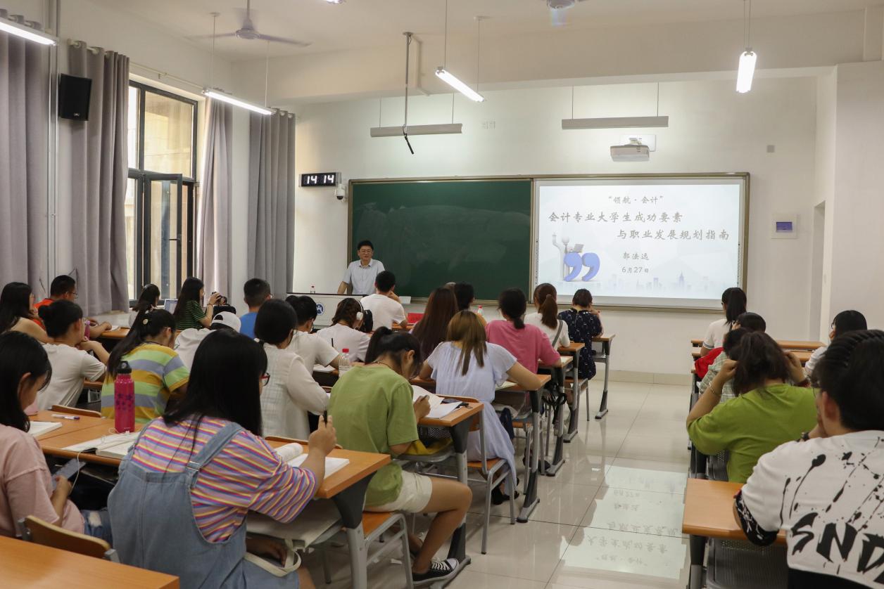 6月27日下午14:00,由MG电子 合作发展处(校友工作办公室)主办,MG电子 承办的中财财经讲座第四讲、中泰财经讲座第四期、校友讲堂第23期暨“领航•会计”资深校友经验分享会在圣井校区6-111教室举行。MG电子 1990级会计本科校友郭法远做了题为《会计专业大学生成功要素与职业发展规划指南》的主题分享,MG电子 党委副书记崔东峰,辅导员赵鸿雁、孙炯明参加活动。活动由崔东峰主持。