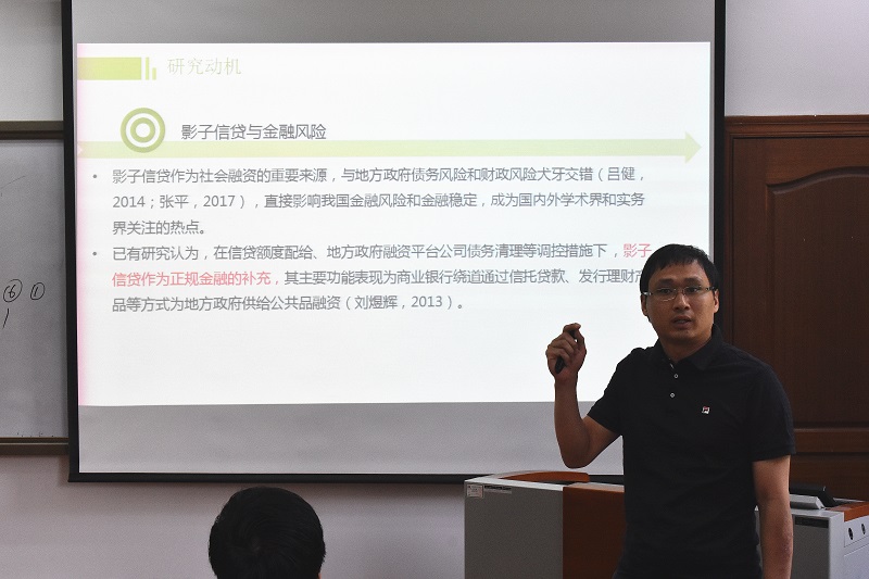 武恒光副教授做了题为《地方官员任期与影子信贷:来自我国地方性商业银行的经验证据》的主题报告。针对研究问题,武老师提出两条理论主线(横向晋升竞争制度—政府之间“经济发展绩效为中心的晋升竞争”与纵向行政发包制度),并据此提出假设:市委书记或市长任期与地方性商业银行影子信贷之间呈倒U型关系。在变量设计方面,武老师分别从数量(非保本理财产品发行量的对数)和金额(手续费佣金与总资产的比例)角度对影子信贷进行度量,从市长任期和市委书记任期两个维度对官员任期进行测量,从地方官员特征、银行特征和城市特征三个层面加入控制变量。此外,武老师展示了主要实证结果(主检验、区分城商行和农商行分组检验)、进一步分析结果(按市长年龄<55和>=55分组检验、按省委书记年龄<60和>60分组检验)和拓展分析结果(分别按经济责任审计覆盖率和经济责任审计强度分组检验、按经济责任审计覆盖率和省委书记任期分组、按经济责任审计强度和省委书记任期分组)。最终得出如下结论:其一,总体上,市长任期对地方性商业银行的影子信贷投放尤其是城商行具有显著影响,显示出明显的倒U型关系,市委书记任期则未产生显著影响;其二,分组检验发现,年轻市长的任期与地方性商业银行的影子信贷投放呈现出明显的倒U型关系,而大龄市长任期则未显示出这种关系;低年龄省委书记的省份,市长任期与地方性商业银行的影子信贷投放呈现出明显的倒U型关系,而高年龄省委书记的省份,市长任期对影子信贷不具有显著影响;其三,政府审计功能发挥不足的情形下/省委书记任期短且政府审计功能弱化的情形下,市长任期与地方性商业银行的影子信贷投放呈现出明显的倒U型关系。