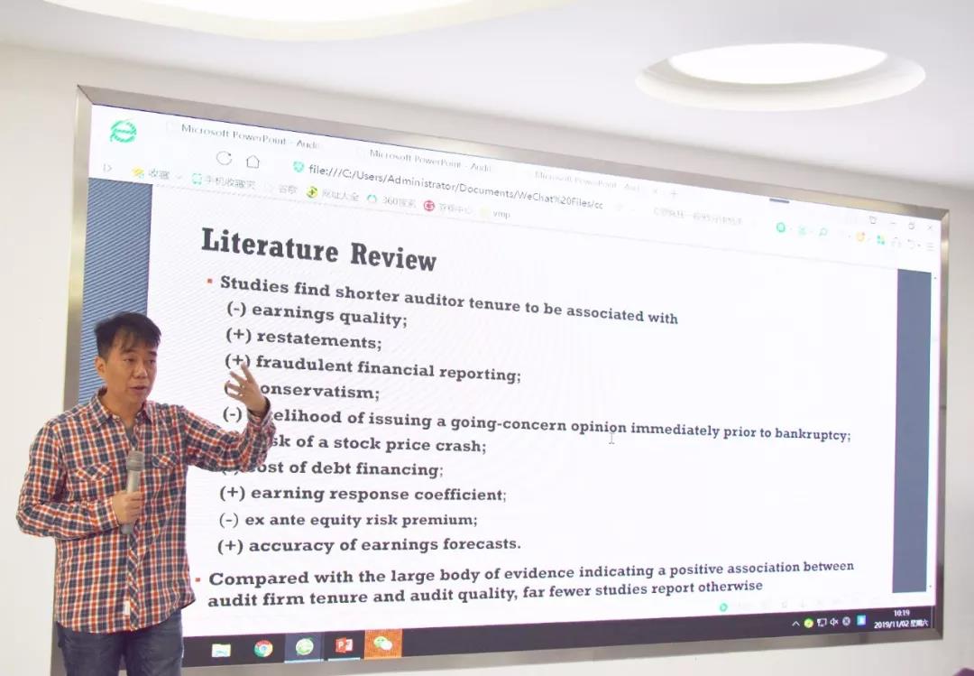 11月2日上午,台湾政治大学戚务君教授应MG电子 邀请,在燕山校区逸夫楼Y320作题为《Auditor Tenure and the Timeliness of Misstatement Discovery: Evidence from Individual Partners》的学术报告。讲座由MG电子 副院长孙文刚主持,MG电子 部分老师以及2019级部分硕士研究生聆听讲座。戚务君教授是台湾政治大学会计系教授,台湾大学商学研究会计组博士,台湾财务报告准则委员会顾问,在财务会计、审计与公司治理领域有很的学术造诣。