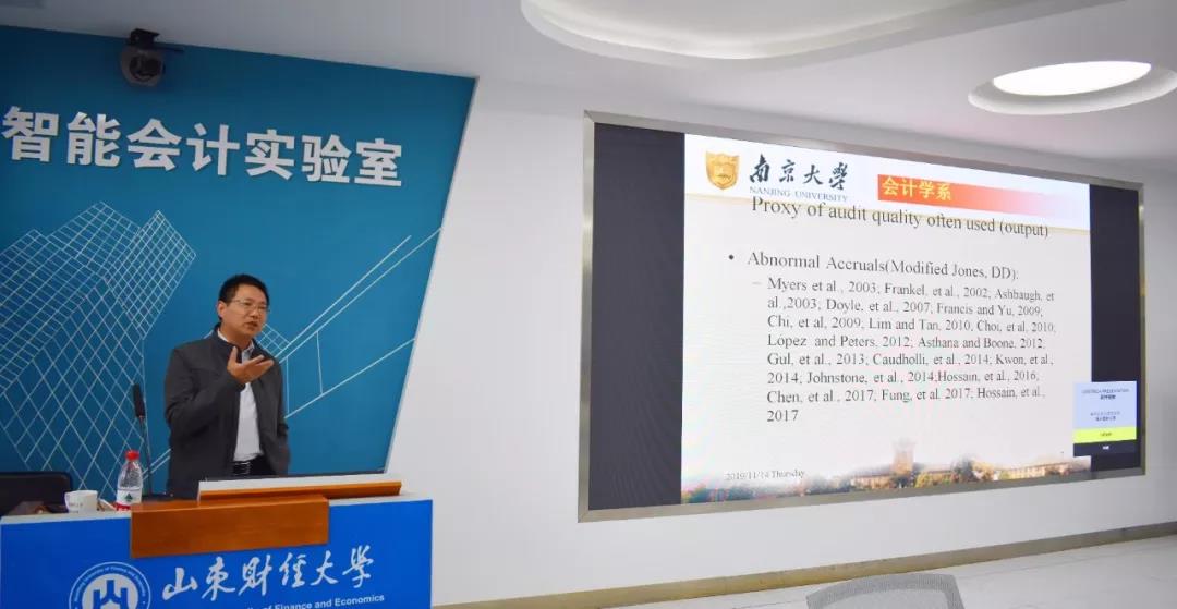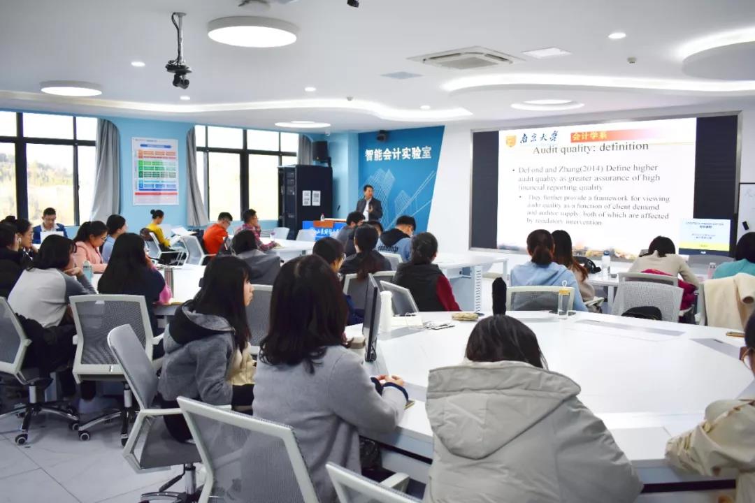 11月14日下午,值校友节之际,MG电子 特地邀请昔日校友、现任南京大学商学院会计学系教授及博士生导师的李明辉教授作题为《独立审计质量研究》的学术报告。该讲座由MG电子 副院长孙文刚主持,MG电子 部分老师及2018、2019级部分硕士研究生到场聆听。李明辉教授兼任中国审计学会理事,主要致力于审计学教学与研究方向。
