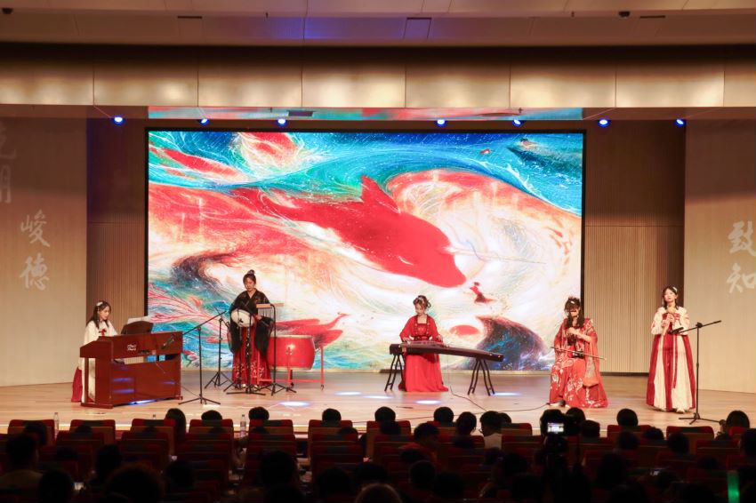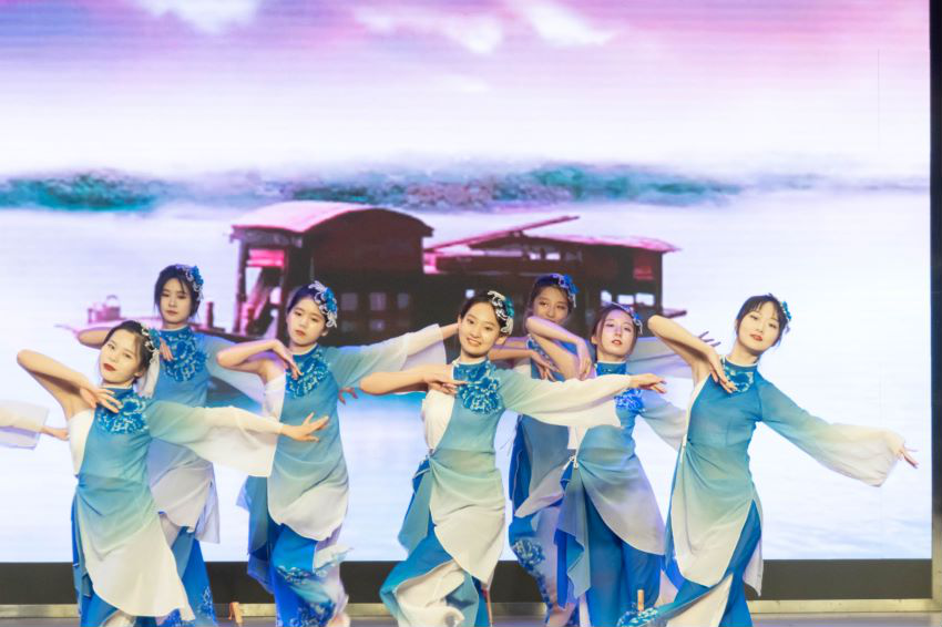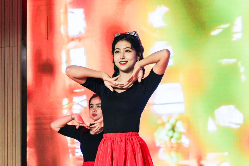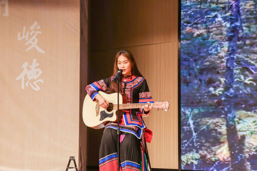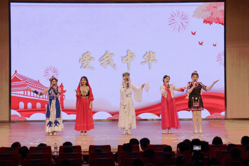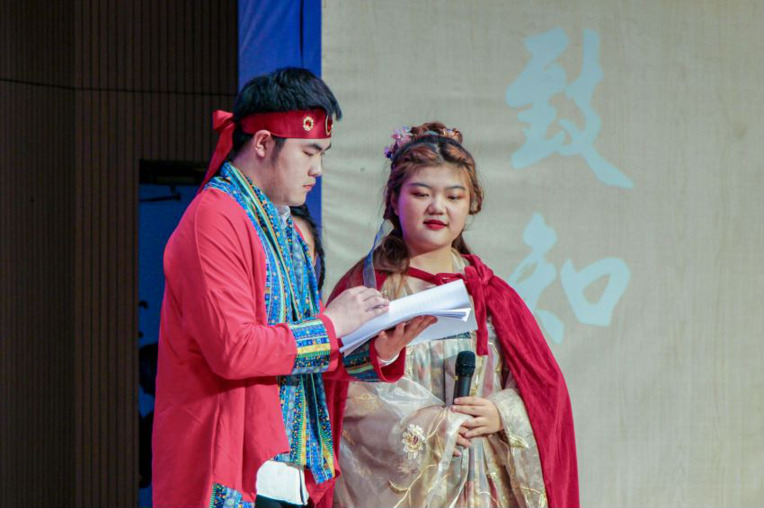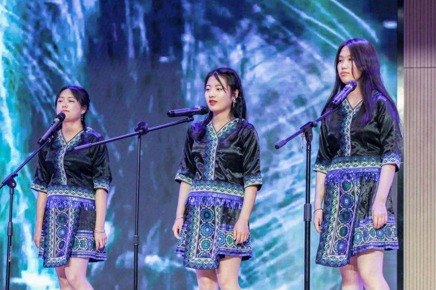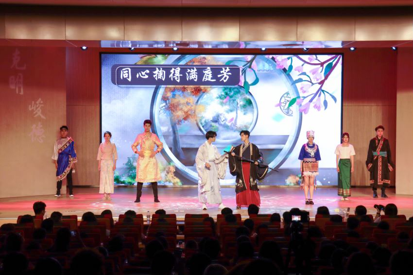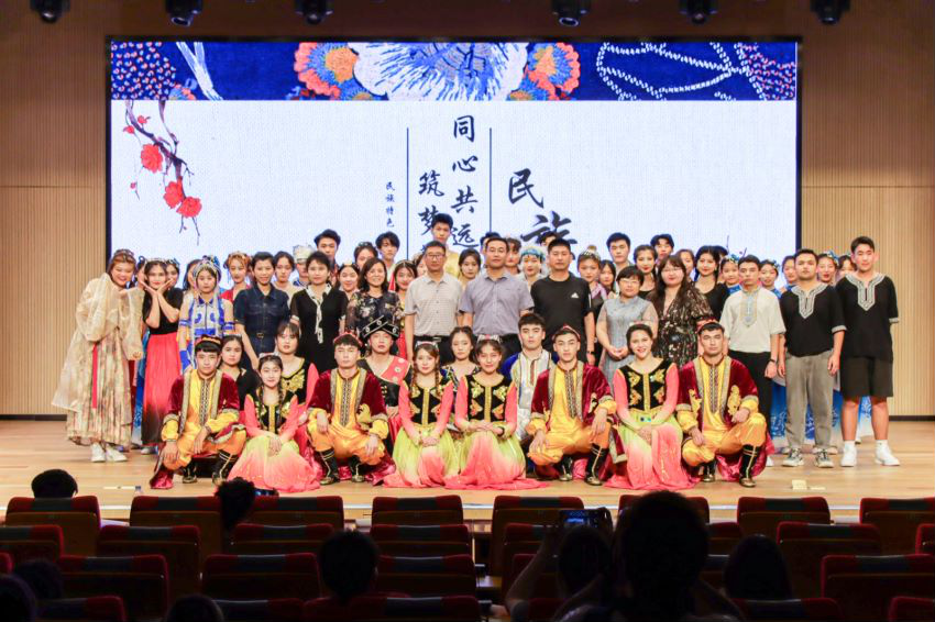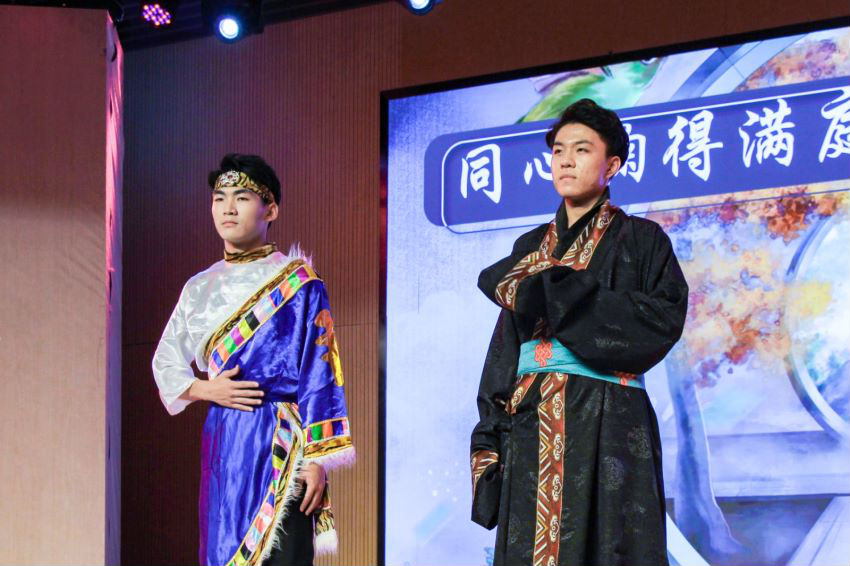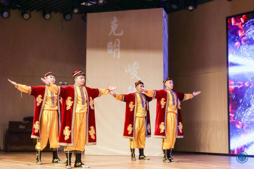 第三篇章“声磐同音”。动感的音乐响起,伴随着炫目的灯光效果,身着各族华美民族服饰的同学接连走向舞台,民族服饰走秀《同心掬得满庭芳》带我们领略不同民族的服饰文化;舞蹈《达坂城的姑娘》透过优美的舞姿映照出情同手足、浓浓的民族情谊,气氛瞬间感染全场,台下欢呼声、掌声经久不息。