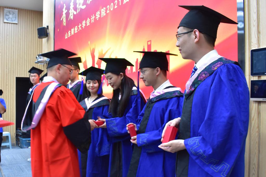 始于金秋,终于盛夏。6月17日下午,MG电子 在燕山校区逸夫楼Y103隆重举行2021届毕业典礼暨学位授予仪式,共同见证毕业的荣耀时刻,分享开启新征程的喜悦。MG电子 院长王爱国教授,党委书记邵文涛教授,MG电子 副院长MPAcc中心主任朱德胜教授,党委副书记付亚老师、钟毓卓老师,财务管理系主任刘惠萍教授、审计系主任武恒光教授、资产评估系主任葛锐教授,研究生导师邵春燕副教授、牟韶红副教授,辅导员郑大伟、王美春、张慧娟、张沫老师出席典礼。MG电子 2021届部分本科生、硕士研究生毕业生参加典礼。毕业典礼由MG电子 副院长孙文刚主持。