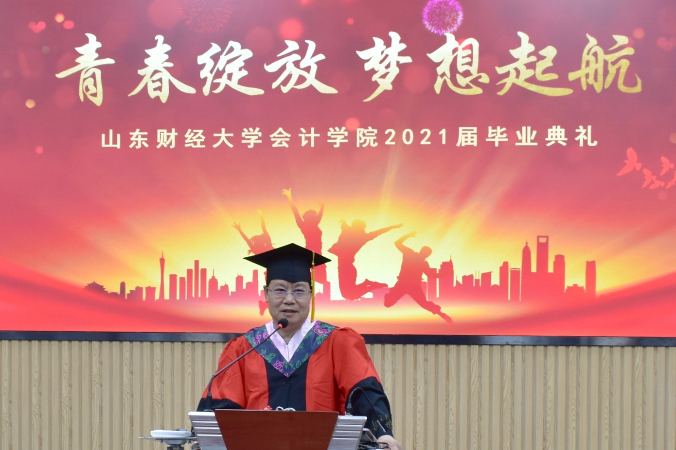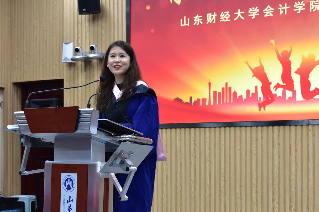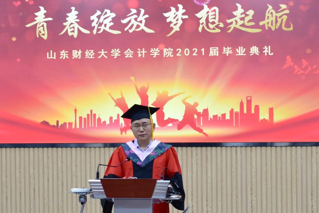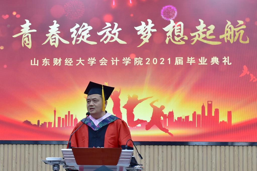 院长王爱国教授上台致辞,向毕业生们表示热烈祝贺和美好祝愿。他与大家共同回顾了山财大明水、圣井、燕山校区的发展建设历程。王院长说,山财浸染了学子的底色,而学子则成为了学校的名片,学校将在建设特色的开放式高水平财经类大学的征程中,把底色打造得更加亮丽绚烂,让你们更加以母校为荣;也期待你们在未来的道路上,继续养浩然之气,明君子之德,秉承着“克明俊德,格物致知”、“内诚于心,外信于人”的校训院训,继续谱写崭新的青春华章。
