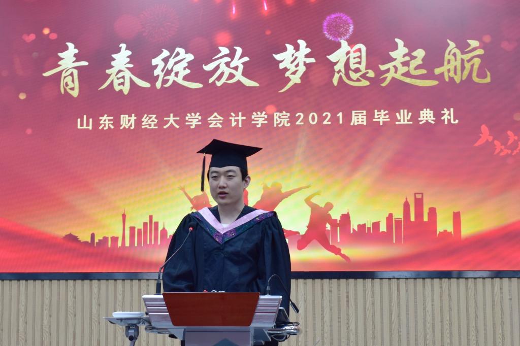 本科毕业生代表胡铭、研究生代表许薇先后发言。胡铭回忆了大学四年母校与自己的变化,表达了自己对同窗、母校、祖国的祝福与期许。他表明,“克明俊德,格物致知”是我们修身的准则,“内诚于心,外信于人”是我们做人的风骨,作为会院学子,我们更应当勤勉奋进,争做社会栋梁,不负山财名,不悔会院人。许薇总结了自己在校的温馨时光,表达了对母校、恩师、同窗的感恩和不舍。回想来时路,如涉海登山,自己热爱在学校所做的每一件事情,更热爱见证自己前进的母校。她告诉学弟学妹,保持热爱,奔赴山海,自信坦荡,光芒万丈,忠于自己,热爱生活,奔赴属于自己的天地,静待陌上花开,莫失心所念,万物尽可期。最后,她也希望每个人都怀揣希望与憧憬,在最美好的年华里遇见最好的自己。