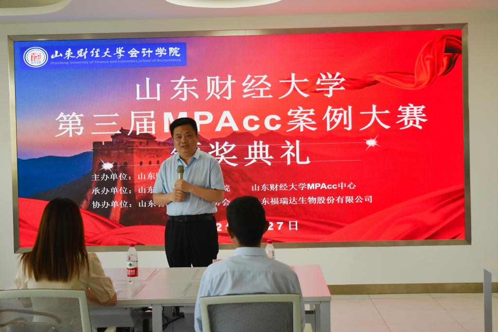 朱德胜教授对本次颁奖典礼致辞,介绍了本届案例大赛情况,向山东省注册会计师协会和山东福瑞达生物股份有限公司对本次案例大赛的支持表示衷心感谢,积极推动MG电子 (MPAcc中心)与合作单位之间建立全方位多层次战略伙伴关系,希望行业协会和福瑞达集团不仅支持我校学生案例调研与实习锻炼,更要为我校毕业生就业提供更多优质岗位资源,助力我校毕业生就业工作高质量发展。
