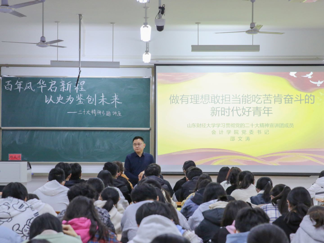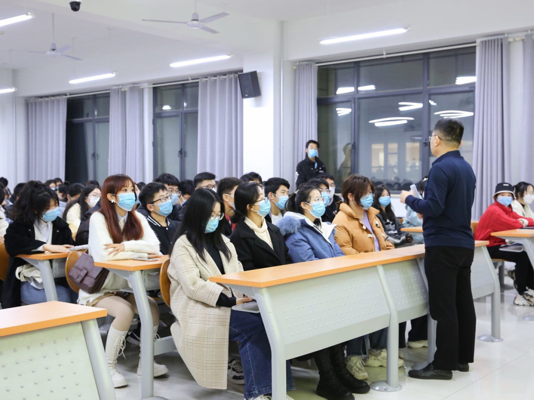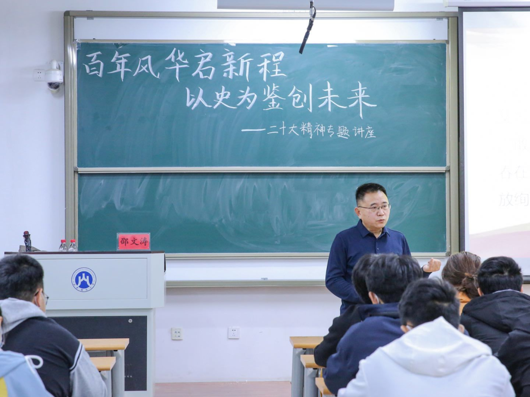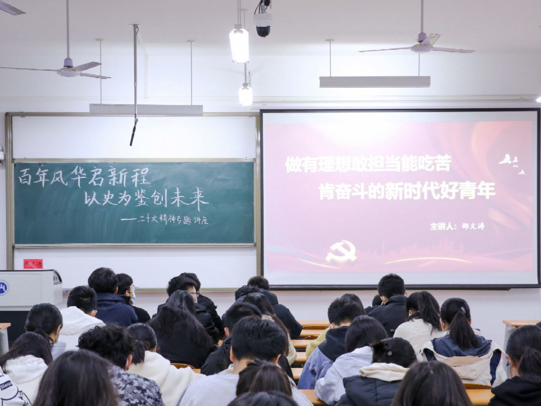 为深入学习宣传贯彻党的二十大精神,把思想统一到党的二十大精神上来,把力量凝聚到党的二十大确定的各项任务上来,引领青年学子坚定不移听党话、跟党走,引导学子们把握历史规律、认清世界形势、融入发展大势,塑造青年学生怀抱梦想又脚踏实地,敢想敢为又善作善成,努力成为堪当民族复兴重任的时代新人,11月15日19:00,MG电子 党委书记邵文涛在圣井校区6218教室为学生们开展“百年风华启新程,以史为鉴创未来”二十大精神专题讲座。