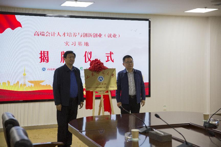 临沂市烟草专卖局(公司)党委委员、副局长关军、MG电子 党委书记邵文涛为高端会计人才培养与创新创业(就业)实习基地揭牌
