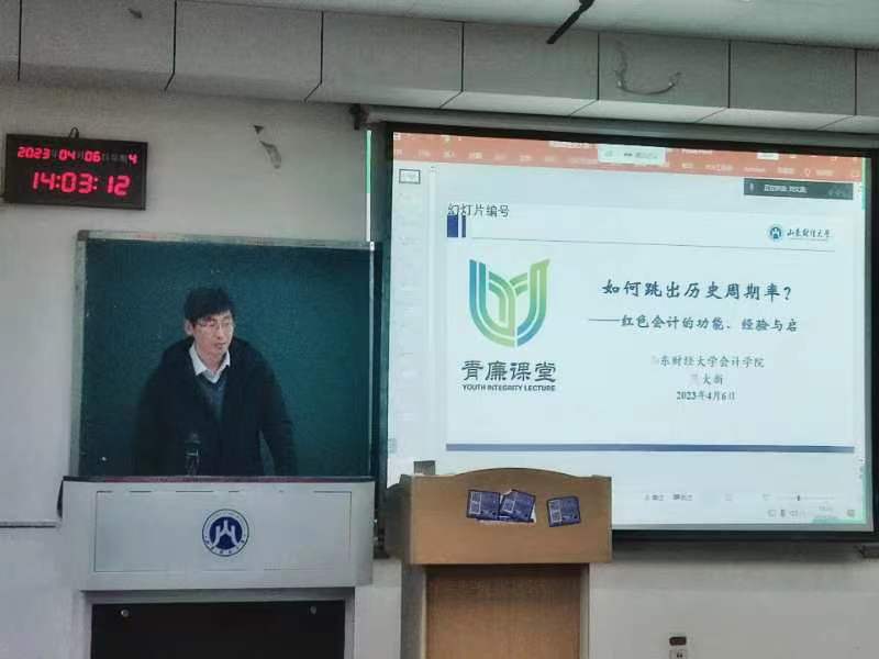 为全面贯彻党的二十大精神,进一步加强新时代廉洁文化建设,按照学校纪委监委推进廉洁教育、开展“青廉课堂”建设活动的要求,2023年4月6日下午,MG电子 党委委员、副院长吴大新教授在逸夫楼Y403作题为《如何跳出历史周期率?——红色会计的功能、经验与启示》的专题讲座。MG电子 2022级全体学术硕士研究生聆听了本次讲座。