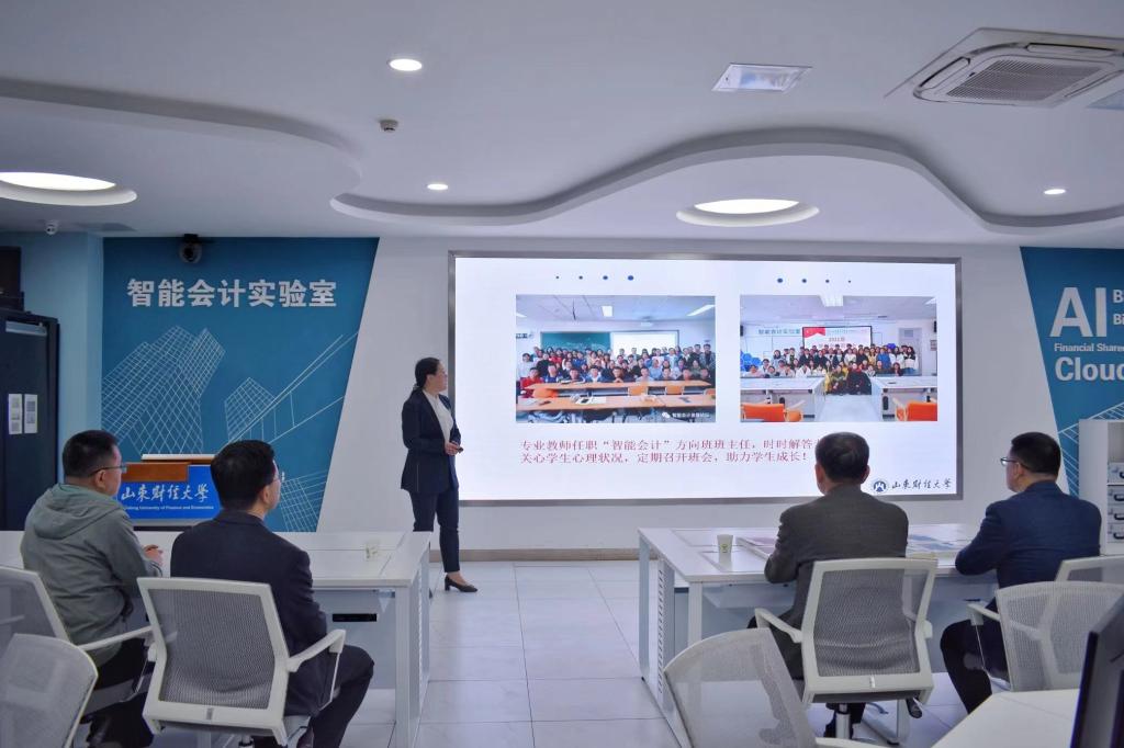 最后,考察组来到智能会计实验室,院长助理、智能会计系副主任李瑞雪介绍了智能会计专业建设和发展方向,就团队建设、人才培养、教学科研、社会服务等方面进行了分享。