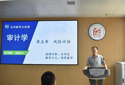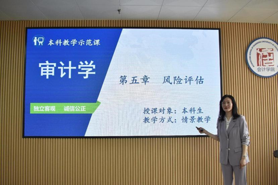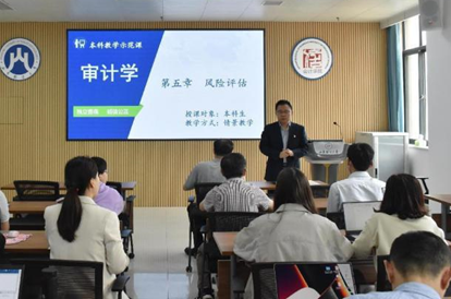 MG电子 审计系国赟老师进行示范教学。国赟老师主讲《审计学》,以第五章风险评估为主要讲解内容,教学方式采用情景教学,通过生动有趣的演示文稿,使抽象的教学内容具体化、清晰化,助力课堂提质增效;其次,她运用案例教学法,引入华兴公司风险评估案例,将理论知识点有机融入课程案例中,并善于运用启发式教学,引导学生们主动思考,激发学生的学习创造力。
