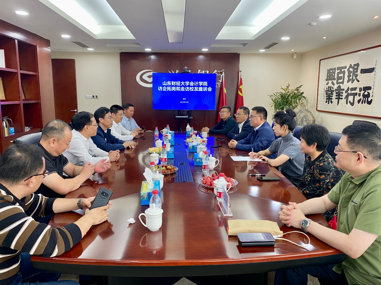 为贯彻落实教育部、省教育厅和我校关于开展高校“访企拓岗促就业”专项行动的工作部署和要求,进一步加强人才供需精准对接,拓宽毕业生就业渠道,10月13日,MG电子 党委书记邵文涛一行赴滨州走访看望校友,与校友座谈,拓展就业实习岗位。兴业银行滨州分行行长朱新军、副行长雷建军、中国工商银行滨州分行副行长徐国刚,以及就职于滨州市市政工程有限公司、滨州市公路局、山东黄河会计师事务所等单位的部分校友代表参加座谈。