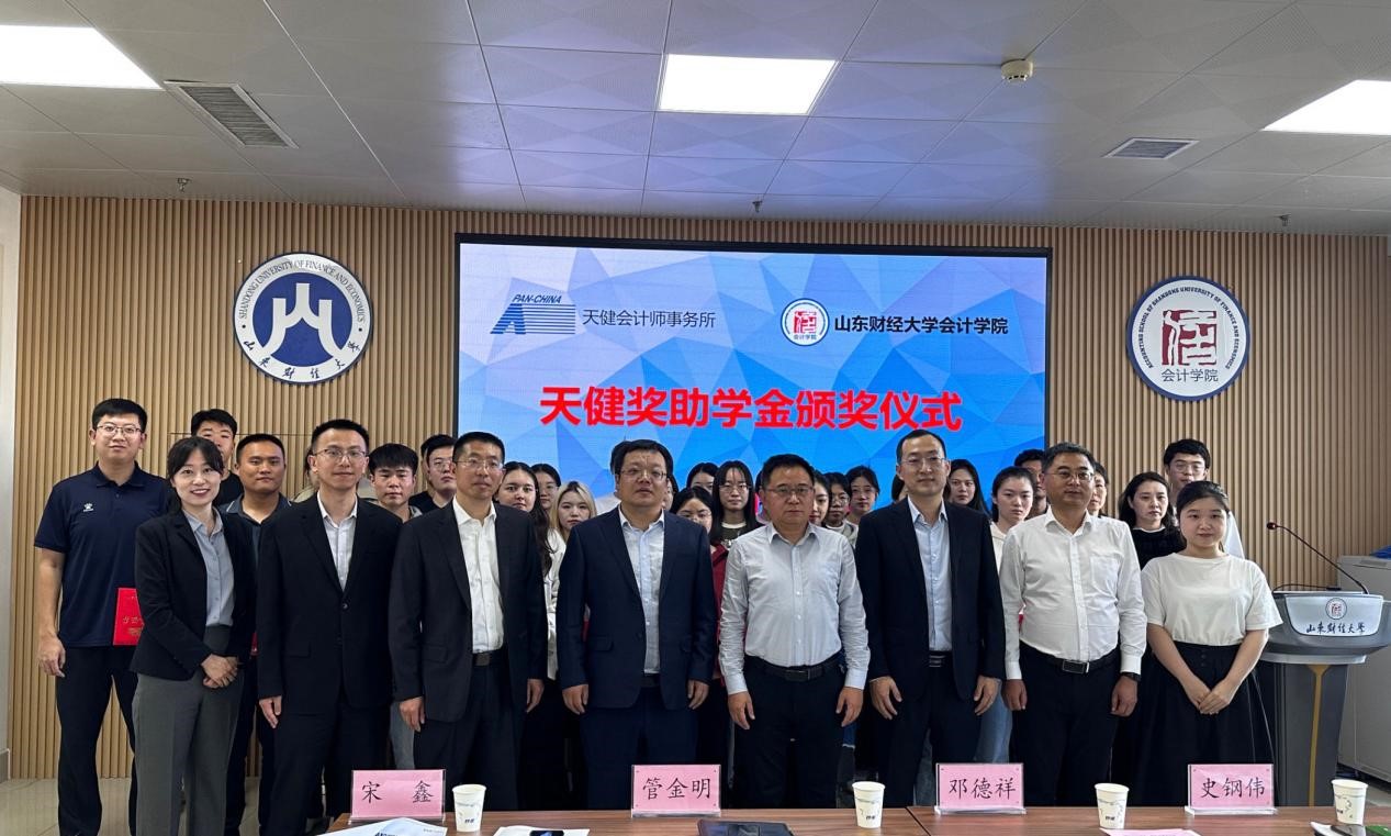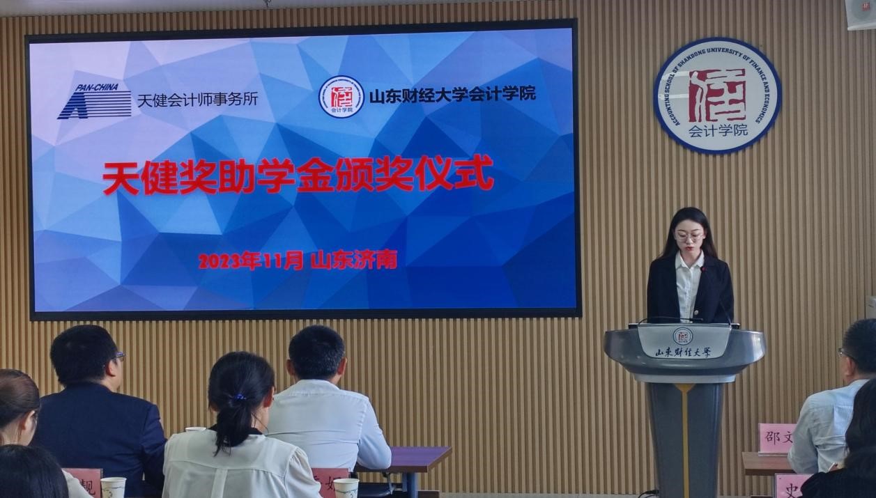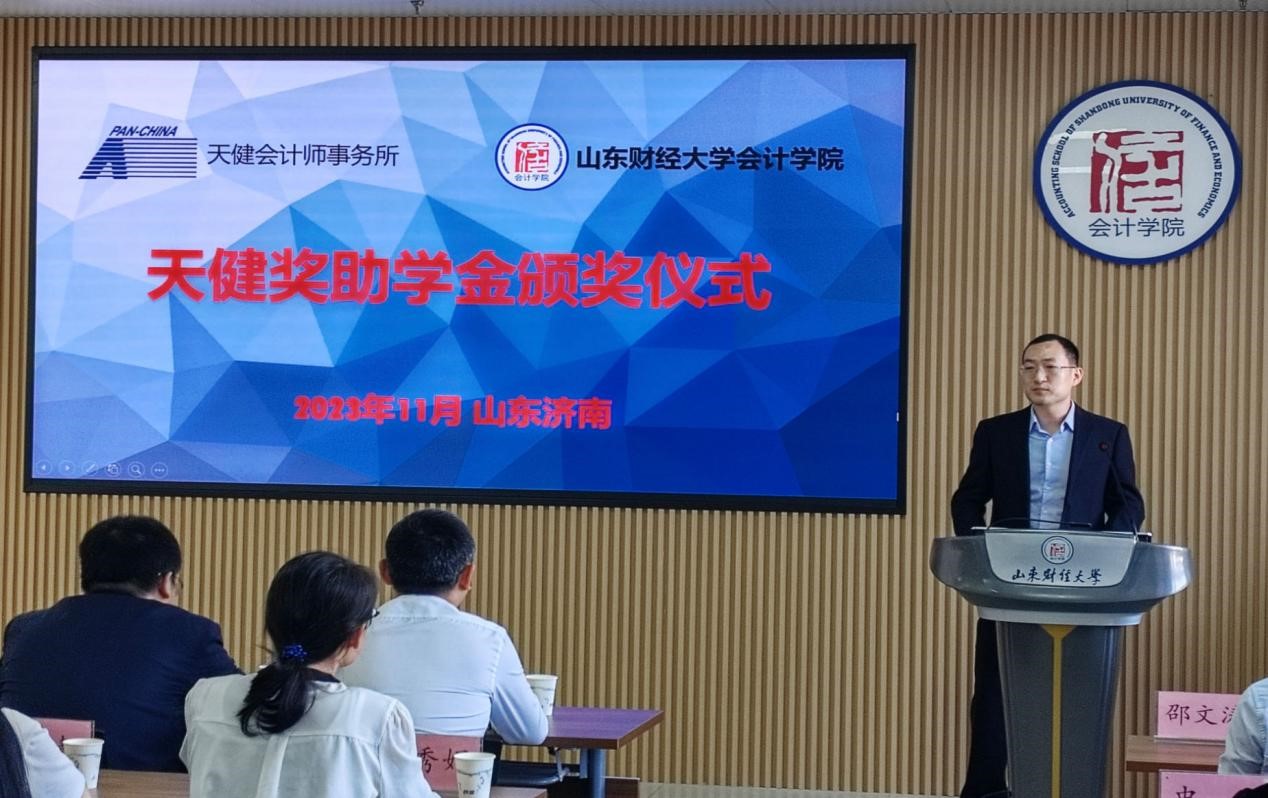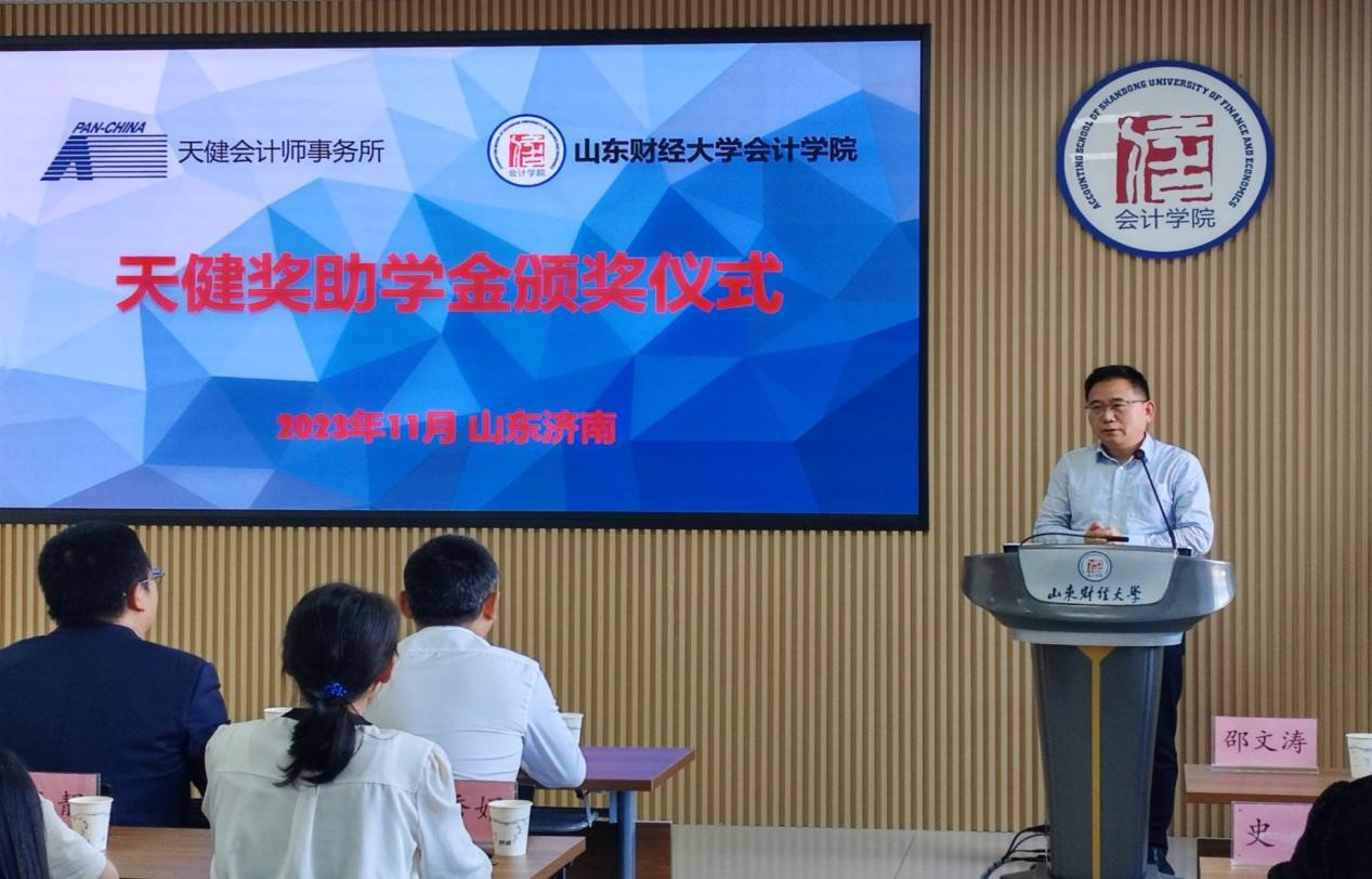 11月1日下午,2023年度天健就业奖助学金颁奖仪式在MG电子 燕山校区逸夫楼举行。天健会计师事务所高级合伙人、山东分所副总经理管金明,高级合伙人、主任会计师助理邓德祥,合伙人宋鑫,合伙人、山东分所总经理助理史钢伟,人力资源总部高级经理韩杰,人力资源总部助理经理林小靓,山东分所人力资源部经理宋小燕,MG电子 党委书记邵文涛以及教师代表、学生代表参加,仪式由辅导员史岩主持。
