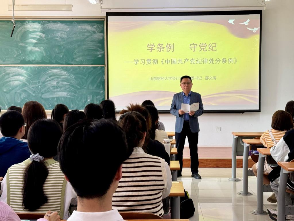 为深入学习贯彻习近平总书记关于党纪学习教育的重要讲话、重要指示精神,学习贯彻党中央决策部署和省委工作要求,不断增强学生党员的责任感、使命感和担当意识,4月25日下午,MG电子 党委书记邵文涛在圣井校区为学生党员讲授“学条例 守党纪”——党纪学习教育专题党课。学院党委副书记钟毓卓,党委组织员、学生第二党支部书记张沫以及圣井校区学生党员参加。