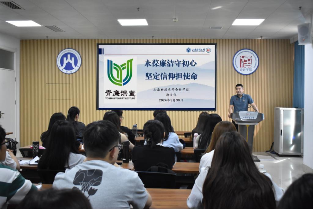 为加强新时代廉洁文化建设,发挥廉洁教育基础作用,进一步夯实清正廉洁思想根基,5月30日上午,MG电子 党委副书记郑大伟在逸夫楼410作题为《永葆廉洁守初心 坚定信仰担使命》的“青廉课堂”专题讲座,学院党员发展对象和入党积极分子参加。