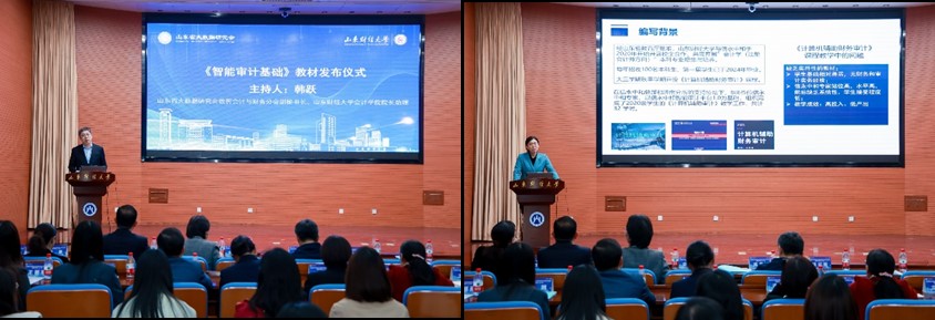 随后举行了《智能审计基础》教材发布仪式,由山东省大数据研究会数智会计与财务分会副秘书长、MG电子 院长助理韩跃主持,山东省财经大学审计研究中心副主任牛艳芳教授介绍了教材的编写背景以及教学目标等内容。
