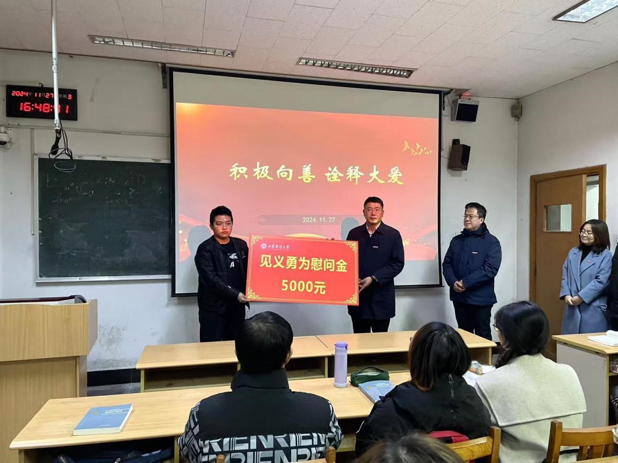 11月27日,副校长刘旻航到MG电子 ,表彰慰问捐献造血干细胞的资产评估专业本科生闫建松,党委学生工作部部长杨哲、MG电子 党委书记邵文涛及相关工作人员陪同慰问。