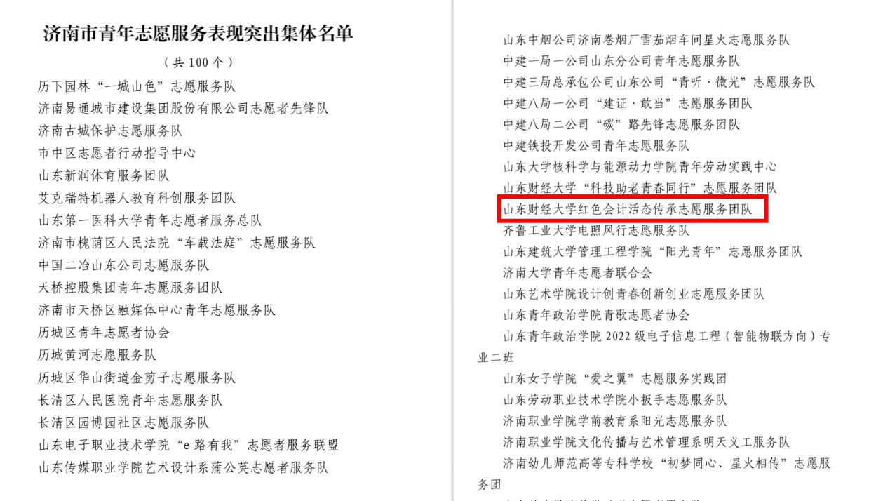 近日,共青团济南市委发文对2024年度济南市共青团工作中表现突出的集体和个人进行表彰,MG电子 “红色会计活态传承志愿服务团队”获评济南市青年志愿服务表现突出集体。
