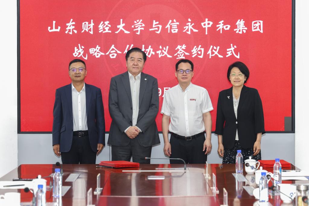 张新主持签约仪式。张红霞与信永中和集团党委副书记、副总裁、济南分部总经理、我校85级校友郝先经签署战略合作协议。
