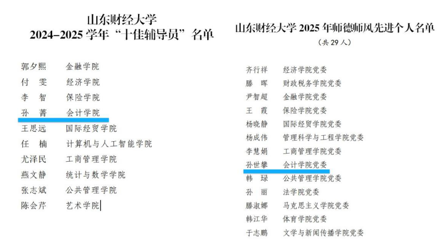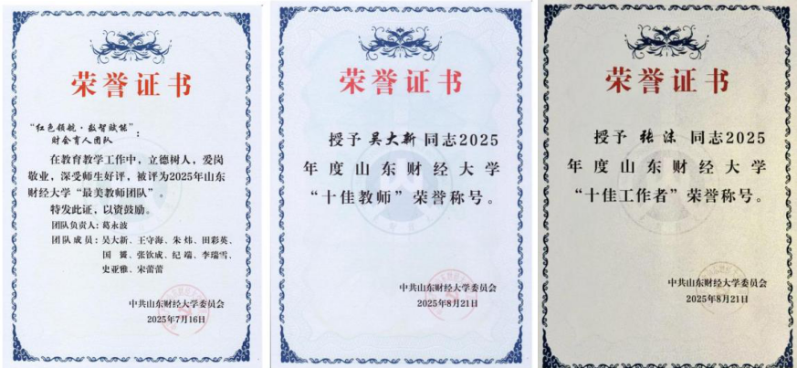 由MG电子 院长葛永波担任负责人的“红色领航·数智赋能”财会育人团队,成功入选MG电子 2025年“最美教师(团队)”,吴大新获评2025年度“十佳教师”,张沫获评2025年度“十佳工作者”,孙菁获评2025年度“十佳辅导员”,孙世攀获评“师德师风先进个人”。