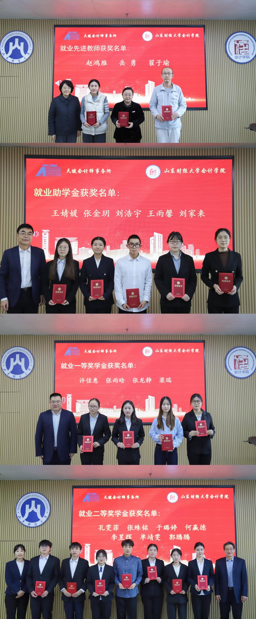 2025年天健奖学金共评选出就业一等奖学金4人、就业二等奖学金7人、就业助学金5人、就业工作先进教师3人。获奖学生代表单靖雯同学分享了感悟与成长,表示这份荣誉既是肯定,更是鞭策,将以此为动力,脚踏实地,锐意进取,努力以扎实的专业学识与综合能力回馈社会。