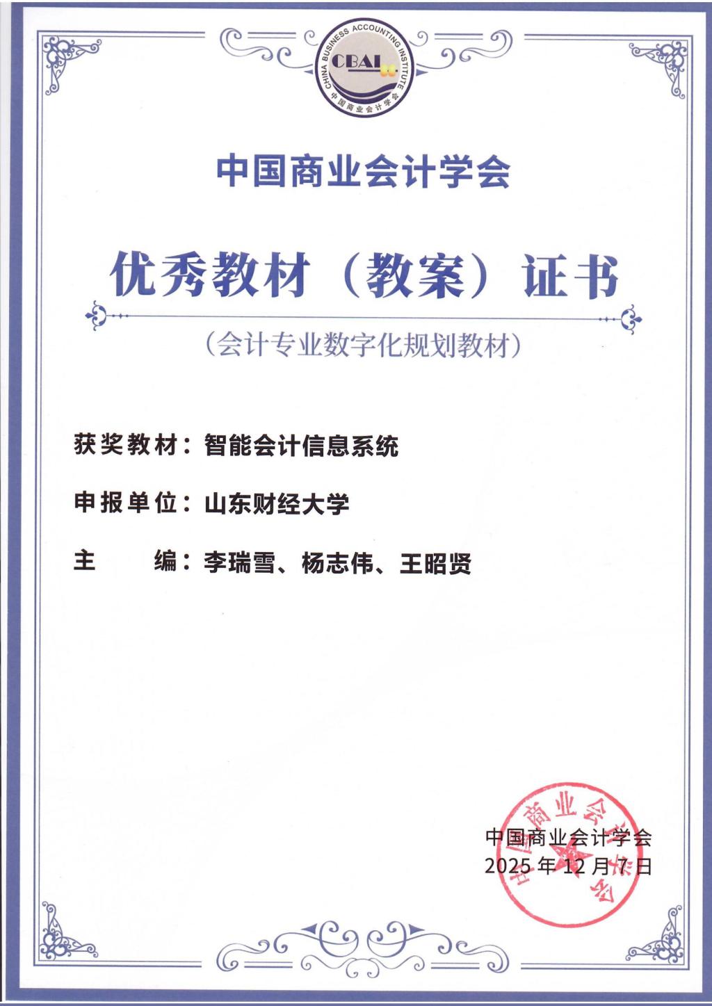 2025年12月5至7日,中国商业会计学会学术年会暨第三届会计教育教学高质量发展论坛于厦门市成功召开,会议期间,对会计专业数字化规划教材进行了表彰。经资格审查和专家评委综合评定,MG电子 李瑞雪副教授主编的《智能会计信息系统》教材(教案)荣获优秀教材(教案)奖,全国共评出6本会计专业数字化规划优秀教材(教案)。