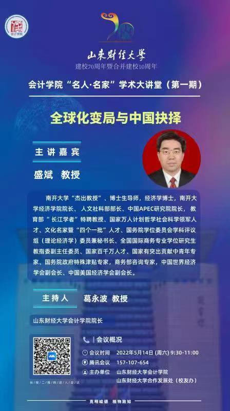 第一期“名人·名家”学术大讲堂将由南开大学经济学院院长盛斌教授主讲,主题为:全球化变局与中国抉择。