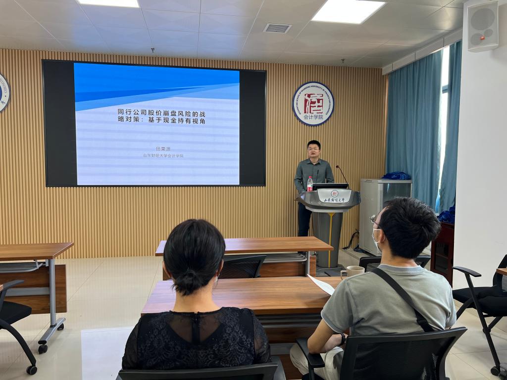 6月8日,资产评估系成功举办了本学期第6期双周学术沙龙。田粟源老师作为主讲人,以《同行公司股价崩盘风险的战略对策:基于现金持有视角》为题做了论文汇报。防范化解金融风险特别是防止发生系统性金融风险,是金融工作的根本性任务。公司股价崩盘风险作为资本市场上最常见的风险指标,越来越受到学术界和实务界的关注。本文以2003-2019年上市公司A股数据研究同行公司股价崩盘风险对公司现金持有行为的影响,并考察了产品市场竞争、股价同步性和融资约束对同行公司股价崩盘风险与公司现金持有之间关系的影响。研究发现:①同行公司股价崩盘风险显著增加了公司现金持有量;②同行公司股价崩盘风险通过融资约束和现金竞争效应渠道影响公司现金持有水平;③产品市场竞争增加了同行公司股价崩盘风险与公司现金持有量之间的正相关关系;④高股价同步性的公司在面临同行公司股价崩盘风险增大时会持有更多的现金;⑤融资约束严重的公司在面临同行公司股价崩盘风险增大时持有更多的现金。研究结果揭示了同行公司股价崩盘风险影响公司现金持有的作用机制,丰富了公司股价崩盘风险经济后果、现金持有和同行效应方面的研究成果,并为维护金融市场稳定和实体经济发展提供重要启示。